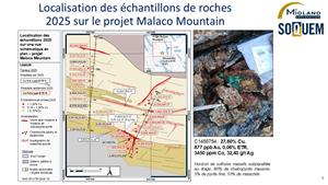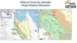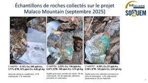 MONTRÉAL, 04 nov. 2025 (GLOBE NEWSWIRE) -- Exploration Midland inc. (« Midland ») (TSX-V : MD) en partenariat avec SOQUEM inc. (« SOQUEM ») a le plaisir d’annoncer de nouveaux résultats dans la zone de cuivre, or et Éléments de Terres Rares (« ETR ») de Malaco Mountain découverte en juin 2025 dans la Fosse du Labrador (voir communiqué de presse du 30 septembre 2025). Ces résultats font suite à la campagne d’échantillonnage de roches menée en septembre 2025 et viennent confirmer le potentiel du secteur. Depuis plusieurs années, un programme de reconnaissance mené dans le cadre de l’alliance stratégique (« l’Alliance ») au Nunavik, cible le secteur central de la Fosse du Labrador, identifié comme étant prometteur pour la découverte de minéralisations économiques en cuivre.